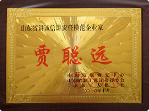 2011年5月份,公司總經理賈聰遠榮獲山東省講誠信、講責任模范企業家稱號并在“山東工人報”和“時代風采雜志”作文章介紹。