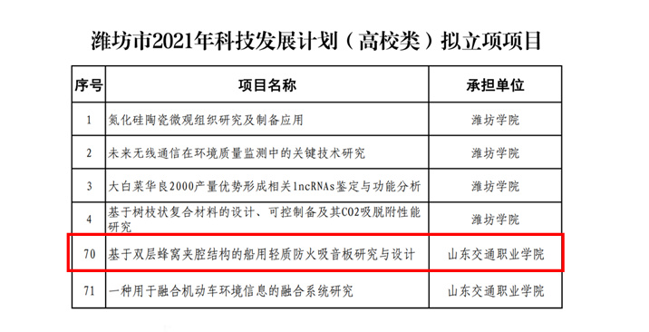 為增強職業健康防護、培育海洋經濟新動能,山東賽特建材股份有限公司與山東交通職業學院簽署科研合作協議,共同開展“基于雙層蜂窩夾腔結構的船用輕質防火吸音板研究與設計”,基于該項目的重大科研價值,項目被列入濰坊市2021年科學技術發展計劃。